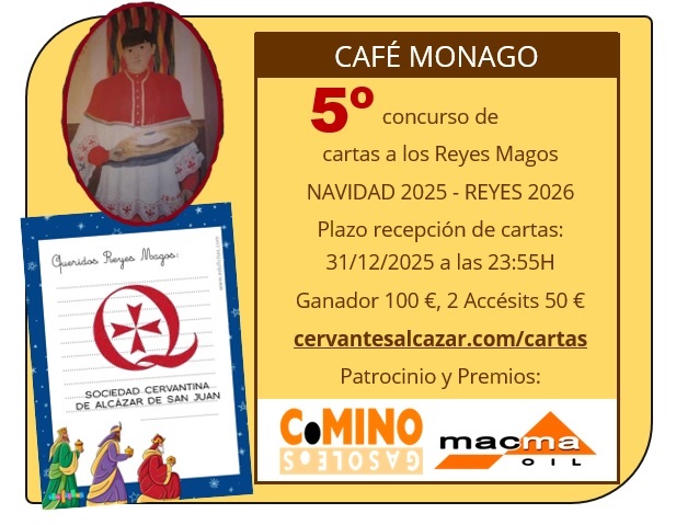 Café Monago y la Sociedad Cervantina de Alcázar de San Juan invitan a adultos de todo el mundo a recuperar la magia de la infancia Fecha de Publicación: 28/11/2025 Un concurso de cartas a los Reyes Magos que alcanza su quinta edición y que demuestra que la ilusión no tiene edad Alcázar de San Juan, 25/11/2025.-En un mundo donde la rutina adulta a menudo nos hace olvidar la capacidad de soñar, Café Monago y la Sociedad Cervantina de Alcázar de San Juan lanzan una iniciativa que promete reavivar la llama de la ilusión en corazones de todas las edades. Se trata de la quinta edición del Concurso de Cartas a los Reyes Magos, una convocatoria especial dirigida exclusivamente a personas mayores de edad que deseen reconectar con la magia que un día llenó sus noches de enero. Una invitación a soñar sin límites ¿Cuándo fue la última vez que escribiste una carta a Sus Majestades Melchor, Gaspar y Baltasar? ¿Cuánto tiempo ha pasado desde que te permitiste pedir con el corazón en la mano, sin pensar en lo práctico o lo posible? Este concurso es una invitación a recuperar ese momento mágico, a sentarte con papel y pluma, y a dejar que tu imaginación vuele libre como cuando eras niño. Pero esta no es una carta cualquiera. Este concurso busca algo más profundo: que los participantes expresen sus anhelos más sinceros, sus sueños guardados en el cajón del tiempo, sus esperanzas para un mundo mejor. Puede ser una carta nostálgica que recupere recuerdos de infancia, un texto poético que juegue con la fantasía y la realidad, una petición humorística que arranque sonrisas, o una reflexión emotiva sobre lo que realmente importa en la vida. Creatividad, originalidad y corazón Los organizadores animan a los participantes a dar rienda suelta a su creatividad. No hay límites ni moldes preestablecidos. Puedes escribir desde la perspectiva de tu yo adulto que dialoga con tu yo niño, puedes inventar una carta en la que los Reyes Magos respondan a las cartas de toda una vida, o crear una misiva que hable de los sueños colectivos de la humanidad. ¿Qué le pedirías a los Reyes Magos si supieras que pueden conceder deseos que van más allá de los objetos materiales? ¿Más tiempo con los seres queridos? ¿Paz mundial? ¿Recuperar aquella inocencia perdida? ¿La valentía para perseguir ese sueño aplazado? Cada carta será un universo único, un testimonio de que la capacidad de ilusionarse es el regalo más valioso que podemos conservar. Un encuentro entre tradición y modernidad La Sociedad Cervantina de Alcázar de San Juan, conocida por su labor cultural y su compromiso con la preservación de las tradiciones, se une a Café Monago en esta hermosa iniciativa que fusiona lo mejor de nuestras costumbres navideñas con el espíritu creativo y literario. Es un homenaje a la tradición de escribir a los Reyes Magos, pero reinventada para adultos que no han perdido la capacidad de maravillarse. Cómo participar La participación es sencilla, pero requiere de tu mejor pluma y tu corazón más sincero: Público participante: Personas mayores de 18 años de cualquier parte del mundo. Formato: Carta libre dirigida a los Reyes Magos, en español. Extensión: Máximo dos hojas en tamaño A4 con letra Arial de 12 puntos y espacio mínimo de 1,5 líneas. Temática: Absolutamente libre. Desde lo más personal hasta lo más universal, desde el humor hasta la emoción más profunda Originalidad: Las cartas deben ser inéditas y de creación propia Los textos serán evaluados por un jurado que, como se especifica en las bases, valorará estos cuatro apartados: la adecuación al tema, el estilo de escritura y manejo del idioma castellano (calidad literaria), la originalidad y la transmisión de valores positivos. Pero tendrá muy en cuenta también, la capacidad de emocionar y transmitir esa magia que hace especiales estas fechas. Un regalo para el alma Este concurso es mucho más que una competición. Es una oportunidad para hacer una pausa en medio del ajetreo de la vida adulta, para reconectar con nuestro niño interior, para escribir sin censuras, para soñar en voz alta. Es un recordatorio de que nunca es tarde para pedir, para desear, para creer. En tiempos donde el cinismo a veces parece ganar terreno, iniciativas como esta nos recuerdan que la ilusión es un acto de rebeldía, de esperanza, de humanidad. Porque los adultos también necesitamos magia, también merecemos escribir nuestras cartas, también tenemos derecho a creer que, de alguna manera misteriosa, nuestros deseos más profundos pueden hacerse realidad. Una convocatoria universal Desde Alcázar de San Juan, cuna de tradiciones y cultura, esta convocatoria trasciende fronteras. Personas de España, América Latina y cualquier rincón del mundo donde se hable español están invitadas a participar. Porque la magia de los Reyes Magos es universal, como universal es el anhelo humano de mantener viva la capacidad de soñar. ¿Te atreves a escribir tu carta?… Deja que tu pluma dance sobre el papel, que tus pensamientos más íntimos encuentren palabras, que tu corazón dicte lo que tu mano escribe. Los Reyes Magos, la Sociedad Cervantina y Café Monago están esperando leer tu historia, tu sueño, tu magia. Porque nunca, nunca es tarde para creer, enviad vuestros trabajos a la web de la Sociedad: https://cervantesalcazar.com/cartas/ ¡Que la magia de la ilusión nos acompañe esta Navidad y siempre! Amén. Sociedad Cervantina de Alcázar de San Juan